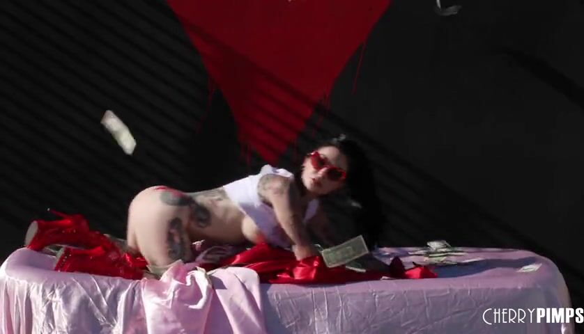 Joanna Angel is officially a Cherry! We welcome this porn legend with open arms, and hope you'll enjoy her scorching hot scenes as much as we do! Here she is teasing off her Cherry Pimps shirt and rolling around in a pile of money. She'll have you feeling hot and bothered in no time, with flashes of her tits as she proudly demonstrates a kick ass preview of what's coming to you from her volcanic scenes. Delight in her big tits and tiny thong as she provides you the expert tease you've come to expect from this tattooed queen!