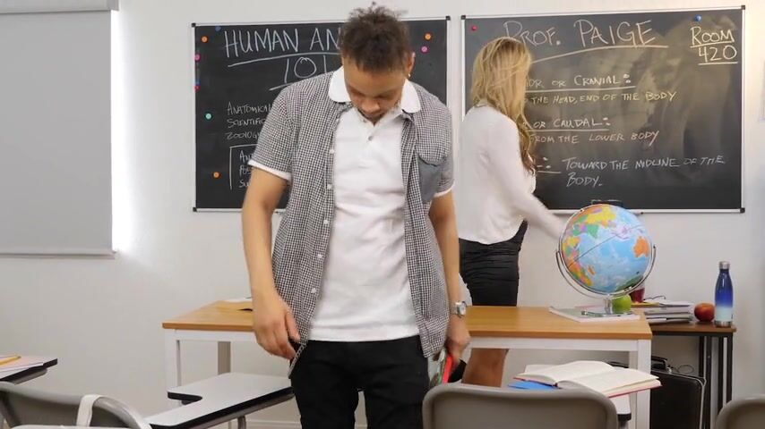 Kayla Paige is one HOT teacher! She has some concern with one of her students and his grade. She knows that it's her nice round ass and perfect big boobs that's the distraction. In order for him to stay focused, she has a wonderful plan -- to let him focus on her and shoot his load all over her MILF tits.