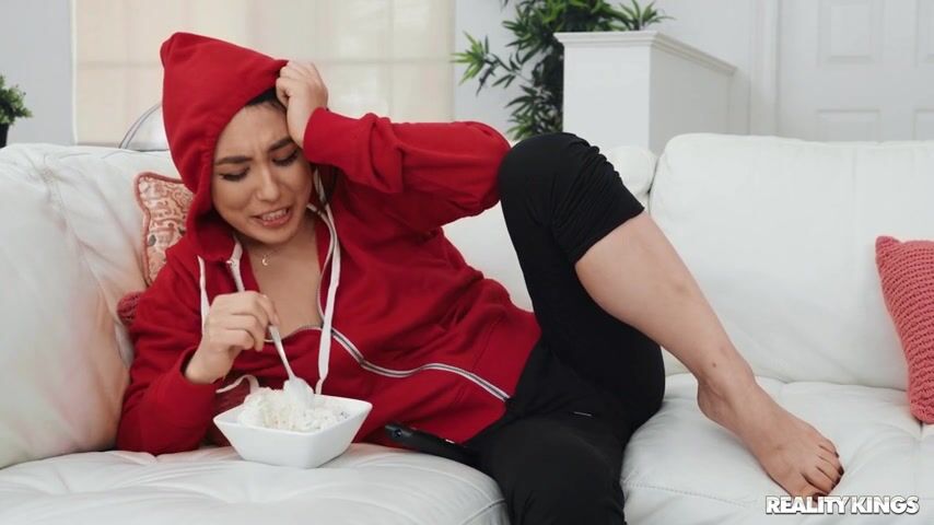 Mina Moon is having an absolute bullshit day. She can't find anything to watch on TV, she can't find her phone and she can't find the cookie in her ice cream, but worst of all, she's been dumped by her piece of shit cheating boyfriend. Her buddy Duncan Saint shows up and is devastated to see his friend in such a bad way. He lends her a shoulder to cry on and a sympathetic ear, but he tells her the only real way to get over a bad break-up is with a great hook-up. Mina strips down to her underwear in her room, reminding herself that under her bulky hoodie and sweats she's got an incredible body and a pair of perky tits that look great in a tiny pink shirt. Duncan can't resist taking a peek, and when Mina comes back out of her room it's not long before the horny friends decide it's time for them to help each other out. Duncan massages Mina's big tits, pulling her tiny shirt aside to get a better look at them before he starts stroking her pussy through her underwear. Mina sucks his finger, getting it nice and wet before he slides it inside of her. Mina and Duncan suck and fuck all over the white couch, Mina straining to fit Duncan's massive cock in her mouth before taking it deep inside her pussy while she rides him in reverse cowgirl.