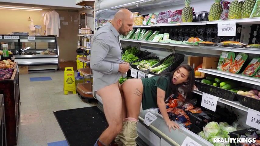 At first sight, petite Kimmy Kimm looks like your typical supermarket clerk. Cute, but seemingly shy, the black haired woman catches customer Jmac's eyes. The guy can't help but try to seduce Kimmy and asks her out for a date while she scans his items. What a surprise when Kimmy invites him to fuck her right now, behind the counter, as she keeps working. Jmac sneaks behind Kimmy's exquisite butt and starts eating her out while she serves unsuspecting customers. Kimmy's pussy tastes so good, Jmac can't resist pounding it by the fruits and vegetables alley. Maybe the depraved Kimmy will lose her job for being so indecent at work, but at least she found a big dick she can fill her pussy with.