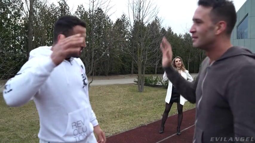 European cutie-pie Jayla De Angelis likes what she sees as trainer Kai Bailey and championship boxer Maximo Garcia spar in the gym. She tells the sweaty, cut studs, 'When you guys fight, it turns me on.' The brunette strips down to lingerie and sucks their big cocks. Kai invades her pussy while she strokes Maximo's rod. Maximo spreads Jayla's hose-encased gams and dips into her sweet cooze. Her natural tits jiggle as he fucks her. Maximo delivers a spoon-position anal reaming, and then Kai stuffs his meat in her bunghole. In a heavy double penetration, she takes Kai's cock in her cunt as Maximo rams her rectum! They switch roles -- Kai's dick rails Jayla's ass as she gives Maximo an ass-to-mouth blowjob. Jayla's asshole gapes widely! The two gladiators lift the little lady from the floor to further stuff her cunt. She opens her mouth for a cum facial and then swallows sperm. If you can't beat 'em, lick 'em!