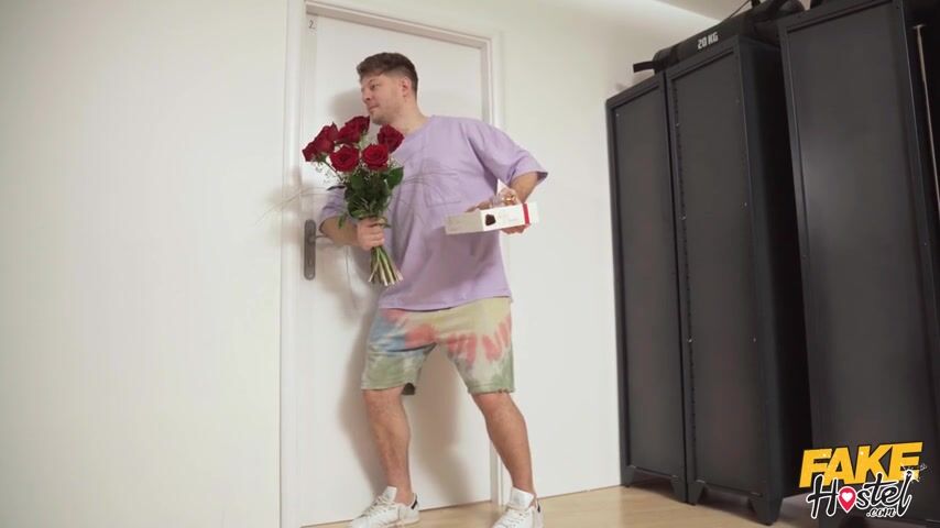Charlie Dorne and Zuzu Sweet are playing cards in the Fake Hostel while Michael Fly eavesdrops on their conversation. Michael hears the ladies lament no one is around to buy them flowers and candy, so he shows up at their door with gifts and takes his small cock out expecting a blowjob! Instead of spit, he's met with laughter! The ladies mock his small cock, and he runs away in sadness. Charlie tries out the perfume Michael has bought for them, and when the fumes reach his nostrils, his dick grows three sizes. Now turned on, Charlie and Zuzu give him a double blowjob, then Michael takes turns stuffing their pussies until he cums in both of their pretty mouths!