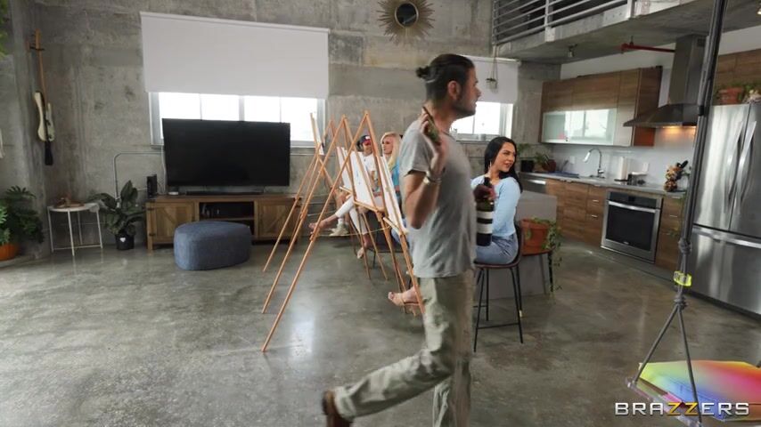 Robbin Banx and MJ Fresh are attending a Sip & Paint class. They are having a wholesome time until the nude model, Duncan Saint, shows up. When Duncan takes off his towel and reveals the tree trunk between his legs, it's all Robbin and MJ can focus on! Soon, MJ is secretly rubbing her pussy while she looks at Duncan's huge cock and Robbin is in shock. MJ can't take it anymore - she joins Duncan on stage and starts deepthroating his delicious dick. Robbin quickly gets over her stage fright and joins the couple on stage. No one could have guessed it but this Paint & Sip class just turned into a threesome smash!