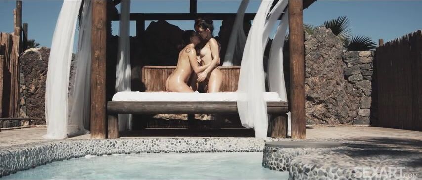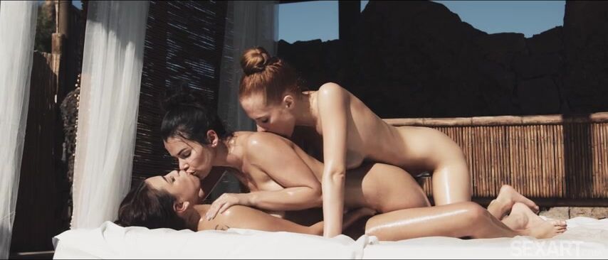 Three naked beauties pour oil over one another’s glistening bodies, in Andrej Lupin’s erotic lesbian threesome "Slick." Gorgeous brunette Jessy Jey, cute redhead Holly Molly and Latina beauty Camila Palmer are in a shady poolside cabana, hands roaming over slippery curves and massaging sensuously. The girls come together in a passionate threeway kiss, lips finding nipples and fingers finding clits. Camila frigs Holly’s glossy slit from behind while Holly rubs against Jessy, kissing her hungrily. Then Holly lies in Camila’s arms as Jessy’s fingers glide over her clit repeatedly, coaxing her to a breathless orgasm. They turn their attention to Camila, Holly sucking her nipples while Jessy fingerbangs and eats her pussy until she climaxes. Jessy is sandwiched between her girlfriends, spinning around to straddle Camila in a sixty-nine and ride her face while Holly masturbates, cumming together in a flurry of gasps and moans.