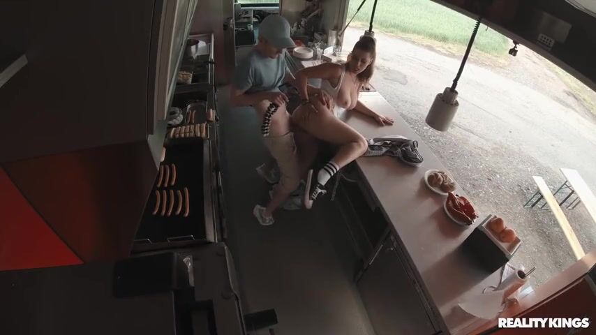 Food truck reviewer Lady Lyne is back for another vlog at what might be one of the best food trucks yet, but she spills special sauce all over her big tits! She asks employee Sam Bourne for help, and he lets her come behind the counter to clean up. Sam even shows her how the sausage is made... but Lady wants a taste of his very special sausage too. Lyne straps on an apron and sucks Sam's cock, then gets that man meat in her pussy hot-doggystyle! Her huge tits bounce as Sam gives her the special before topping her pussy with his sauce.