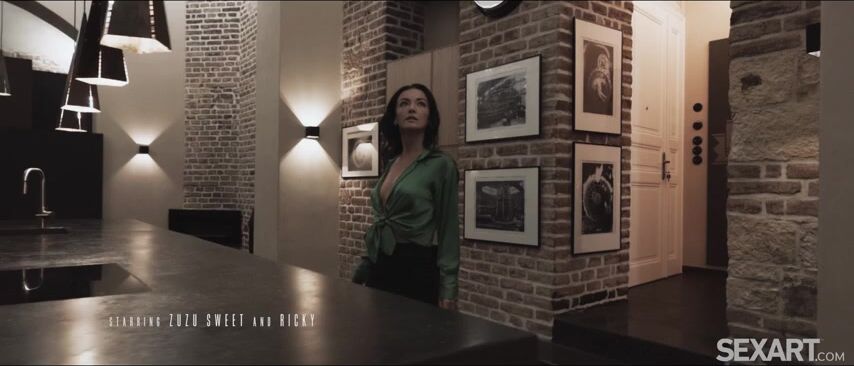 Gorgeous Zuzu Sweet walks into Ricky’s apartment and is swept up in a fiery embrace. As Andrej Lupin’s erotic movie "Get Loose" begins, the lovers kiss passionately, hands roaming. Ricky lifts Zuzu onto the kitchen counter and sucks her nipples voraciously, then tugs her panties aside and eats her pussy until she’s trembling and gasping through an intense orgasm. Zuzu frees Ricky’s rigid cock from his pants and drops to her knees to suck it, her lips and fingers sliding up and down his thick shaft avidly. Bending Zuzu over the counter, Ricky thrusts into her from behind, grabbing her jiggling breasts as he fucks her with vigorous strokes. She has another powerful climax, then they rush up the stairs, stopping halfway up for another wild clinch before they make it to the bedroom. Ricky presses Zuzu against the glass wall and slams into her with renewed energy, her body arched in ecstasy. They stumble to the bed and Zuzu straddles Ricky and grinds on his cock, then impales herself in cowgirl. She rocks her hips sensuously, her sexy ass rippling as she moves into a squat to ride even harder. They orgasm together, their torrid passion mellowing to tenderness.