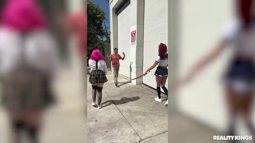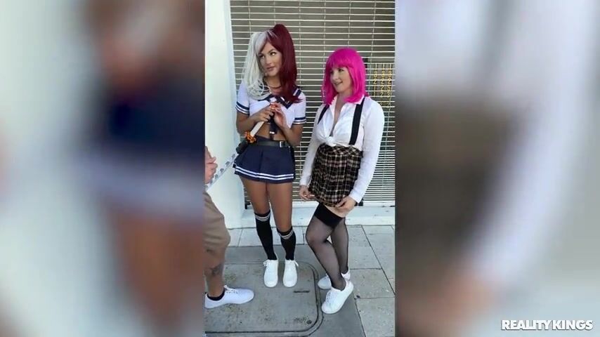 There's a big convention coming up, so today dedicated cosplayers Bess Breast and Mila Monet are testing out their new schoolgirl costumes. The babes chat about what they love most about dressing up, then head out to see which of them passersby find sexier. The hotties run into Oliver Flynn, who says he'd love to fuck both of them, so they invite him home to do just that! Lucky Oliver gets two costumed nymphos sucking and riding his dick, but which one will be declared the sexiest?