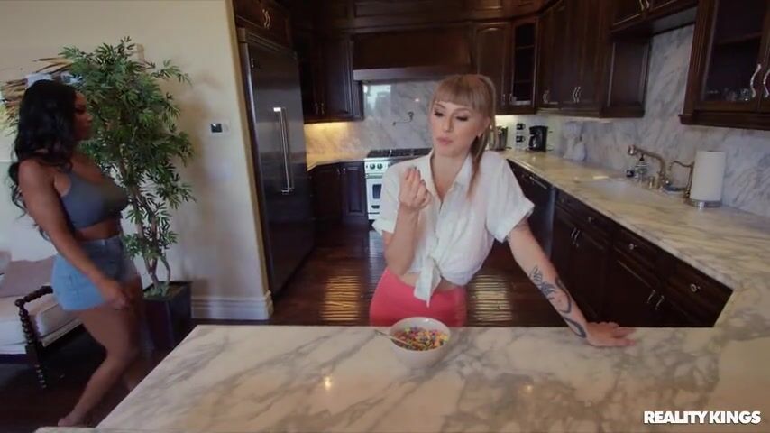 While Angel Youngs is in the shower, her roommate August Skye decides to make her move on Angel's man, Scott Nails. August interrupts his breakfast to pull Scott into the bedroom for a sneaky blowjob and even rides his dick, but she's not the only horny hottie in the house! Angel calls Scott into the bathroom to fuck her doggystyle on the floor, and when August sneaks in to watch, she ends up joining in for a hot morning threesome.