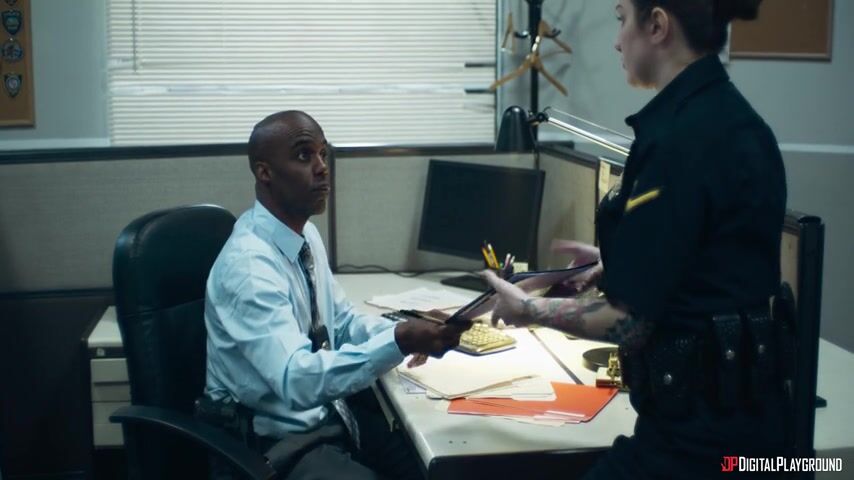Captain Warren (Penny Barber) is on the warpath after the jailbreak, and Officers Bishop (Nicole Kitt) and Jones (Alex Jones) are the first targets for her wrath, but when a ransom video from Gibbs arrives, it's all hands on deck. Warren wants to ensure Bishop and Jones are going to be team players, so she kisses Bishop, then Jones. DA Hopkins (Isiah Maxwell) joins in the foursome, fucking Bishop while Jones pounds the captain's pussy! Warren warns the rookies to keep their mouths shut about the traitor Detective Harris and do whatever it takes to bring Officer Allff home.